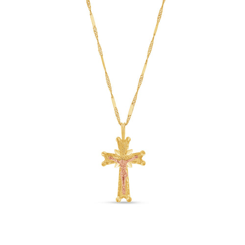 Embrace timeless faith with the Antique Style Cross Crucifix Pendant in 14k gold. The rich two-tone design brings out every detail with warmth and dimension, blending artistry with devotion. Its polished finish adds a graceful shine, making it a meaningful piece that complements both everyday wear and cherished moments.