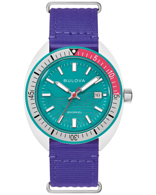 Inspired by the vibrant colors of coral reefs, this Bulova Snorkel Limited Edition stands out with a teal wave-pattern dial and a white hybrid ceramic case that feels both light and luxuriously smooth. The striking violet #TIDE Ocean Material® NATO strap is crafted from recycled ocean-bound plastic to support sustainability while maintaining bold style. With 100 meter water resistance, luminous markers and hands, and a rotating bezel, the watch is as ready for daily wear as it is for poolside or surfside moments.