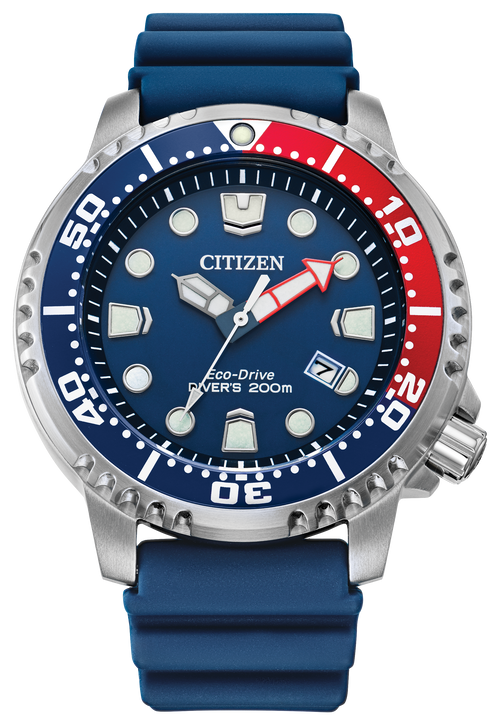 Designed for aquatic adventures, this ISO-certified dive watch features a 44mm stainless steel case paired with a vibrant blue dial. Luminous hands and markers ensure visibility in low-light conditions, while the unidirectional rotating bezel, accented in red and blue, allows for precise dive time tracking. A durable blue polyurethane strap offers comfort and resilience, making it suitable for both underwater exploration and everyday wear. Powered by Eco-Drive technology, it harnesses light from any source, eliminating the need for battery replacements. Water-resistant up to 200 meters, it's built to withstand the rigors of deep-sea diving.
