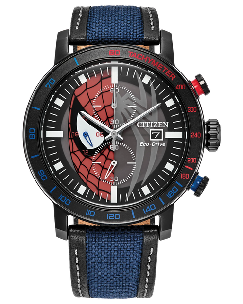 Black dial with Spider Man graphic design, chronograph subdials, and date display