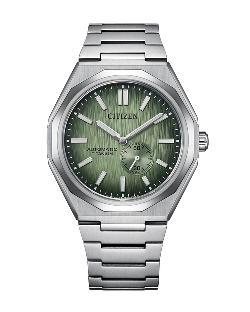 Refined, durable, and effortlessly modern, this Citizen pairs Japanese precision with everyday practicality. The gradient green dial draws attention with understated depth, complemented by the smooth finish of Super Titanium for strength without weight. Its automatic movement delivers 60 hours of power reserve for dependable performance, while the sapphire crystal and integrated bracelet keep the look clean and confident from office to weekend.