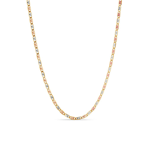 A timeless expression of craftsmanship, the Classic Valentino Chain in 14k tri-color gold radiates elegance and versatility. Its alternating pattern of white, yellow, and rose gold links creates a soft shimmer that complements any look, day or night. With its polished finish and sturdy construction, it’s a refined choice that adds sophistication to both casual and formal styles.