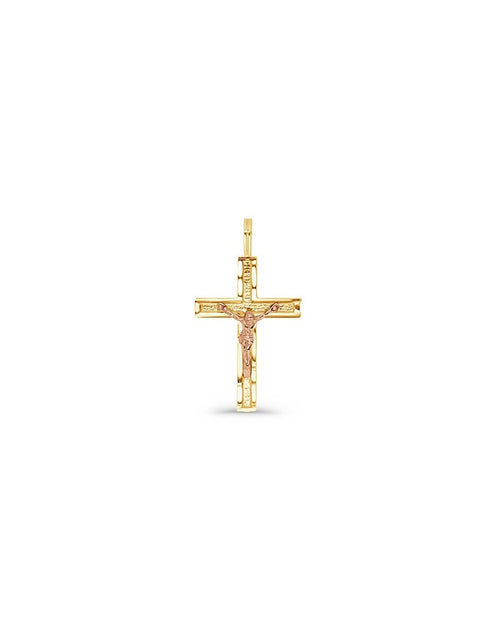 This Diamond Cut Cross Crucifix Pendant blends faith and fine craftsmanship in a radiant 14k gold design. Each edge features precise diamond-cut detailing that catches light beautifully, while the rose gold crucifix center adds depth and warmth. The polished finish enhances its brilliance, creating a timeless expression of devotion and style.