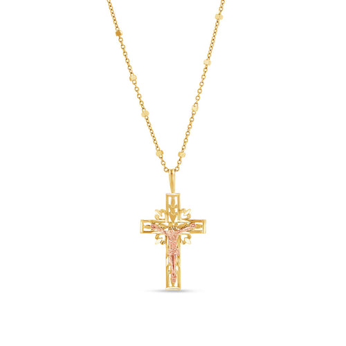 This refined Filigree Cross Crucifix Pendant captures devotion through craftsmanship. Crafted in 14k gold with a soft two-tone finish, its filigree design reflects light beautifully while the rose gold figure adds warmth and dimension. A piece that feels both meaningful and elegant, it complements faith with timeless style.