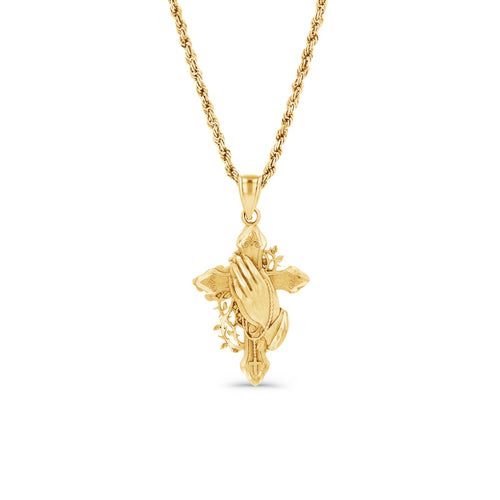 This Prayer Hands Cross Pendant in 14k gold reflects devotion through fine craftsmanship. Detailed praying hands rest over an ornate cross, surrounded by delicate vine motifs that add depth and grace. The polished finish brings a soft radiance, creating a piece that carries both spiritual meaning and timeless elegance.