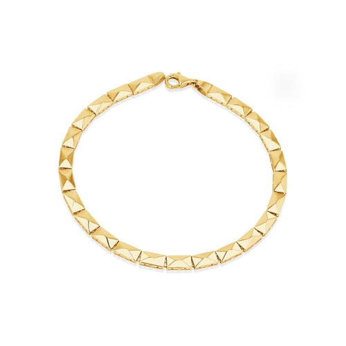 This Prism Bracelet steps into the spotlight with a clean geometric rhythm, its faceted gold links creating a quiet choreography of light as they move. Each angled segment reflects a crisp gleam that feels architectural and intentional, giving the design a sculptural clarity that draws the eye without ever overwhelming the wrist. The understated structure makes it an effortless choice for adding sleek refinement to your look, offering a piece that reads as both contemporary and timeless.