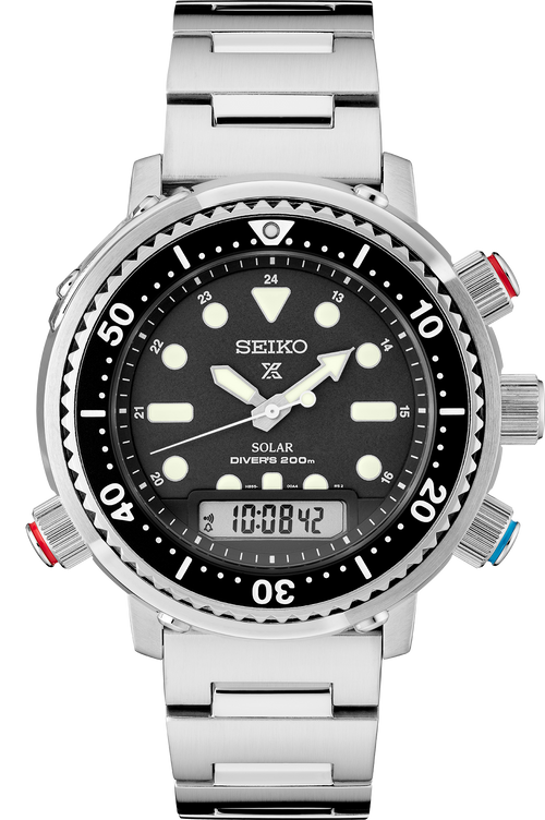 Prospex Solar Analog-Digital Diver’s Watch. Designed for those who treat life as the ultimate adventure, Seiko Prospex keeps moving forward, meeting every challenge with technological excellence and winning design. Featuring the new H855 caliber movement, this rugged and dynamic timepiece commemorates the 40th anniversary of the H558-5000, introduced in 1982 as the world’s first analog-digital hydrid diver’s watch with an alarm and chronograph. Essential equipment for the Japanese Antarctic Research Expedition during the early ’80s and on the Japan/China/Nepal team’s 1988 Mt. Everest challenge, this iconic watch also gained a cult following as an ’80s action movie favorite. Upgraded to meet the special demands of deep sea diving, this new design includes such indispensable functions as a diving log, depth meter with auto start and sudden ascent alarm, and a water temperature measurement function, and follows ISO standards for scuba diving. The rich black dial, with LumiBrite hands and markers, offers an enlarged digital display for improved visibility of the chronograph, alarm, time, date, local time, and power reserve readouts. Crafted of stainless steel, this extraordinarily durable timepiece features a screw-down crown, pushers and caseback, uni-directional rotating elapsed timing bezel, and tri-fold push button release clasp with secure lock and extender. The energy-efficient solar cell, powered by any light source, with no battery change required, provides a 6-month power reserve when fully charged. 200m Water Resistant