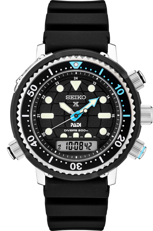 Prospex PADI Special Edition Solar Analog-Digital Diver’s Watch. Designed for those who treat life as the ultimate adventure, Seiko Prospex keeps moving forward, meeting every challenge with technological excellence and winning design. Celebrating the partnership between Seiko Prospex and PADI, the world’s leading scuba diver training organization, this Special Edition features the new H855 caliber movement, commemorating the 40th anniversary of the H558-5000, introduced in 1982 as the world’s first analog-digital hydrid diver’s watch with an alarm and chronograph. Essential equipment for the Japanese Antarctic Research Expedition during the early ’80s and on the Japan/China/Nepal team’s 1988 Mt. Everest challenge, this iconic watch also gained a cult following as an ’80s action movie favorite. Upgraded to meet the special demands of deep sea diving, this new design includes such indispensable functions as a diving log, depth meter with auto start and sudden ascent alarm, and a water temperature measurement function, and follows ISO standards for scuba diving. The black globe-pattern dial, with LumiBrite hands and markers and vivid, highly legible blue accents, offers an enlarged digital display for improved visibility of the chronograph, alarm, time, date, local time, and power reserve readouts. Lightweight as well as durable, this rugged stainless steel timepiece also has a matte black outer case protector and a black silicone strap, and features a screw-down crown, pushers and caseback, along with a uni-directional rotating elapsed timing bezel. The energy-efficient solar cell, powered by any light source, with no battery change required, provides a 6-month power reserve when fully charged. 200m Water Resistant