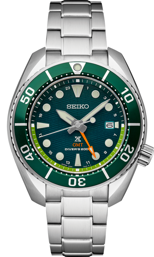 Prospex Solar GMT Diver's Watch. Designed for those who treat life as the ultimate adventure, Seiko Prospex keeps moving forward, meeting every challenge with technological excellence and winning design. Combining Seiko's first solar GMT movement with the bold lines of an iconic Prospex design, this strong and rugged diver's watch features an energy-efficient solar cell, powered by any light source, with no battery change required, providing a 9-month power reserve when fully charged. Designed for high visibility, the deep green sunray dial offers large LumiBrite hands and markers, an orange GMT hand and a date calendar. Following ISO standards for scuba diving at depths of up to 200 meters, this exceptional timepiece, crafted of stainless steel, includes a scratch-resistant sapphire crystal, green uni-directional rotating elapsed timing bezel, tri-fold push button release clasp with secure lock and extender, and screwdown crown and caseback. 200m Water Resistant