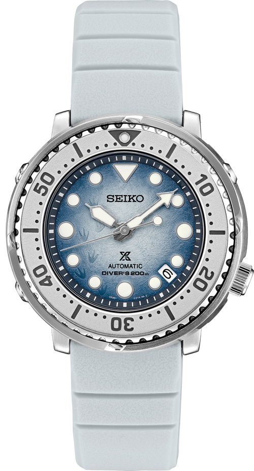 Prospex Special Edition. Designed for those who treat life as the ultimate adventure, Seiko Prospex keeps moving forward, meeting every challenge with technological excellence and winning design. With a gradient textured dial evoking the shimmering whites and blues of light reflecting off ice and the patterns of penguin footprints in the snow, this Special Edition automatic diver celebrates conservation efforts in Antarctica, the challenging environment in which the earliest Seiko diver’s watches proved their excellence as essential equipment for the Japanese Antarctic Research Expedition (JARE). Recalling one of Seiko’s most iconic diving styles, this rugged watch features a uni-directional rotating elapsed timing bezel as well as a secure screwdown caseback and crown. Providing reliable timing in the most demanding conditions, the 23-jewel automatic movement beats at a frequency of 21,600 vibrations per hour, with a power reserve of approximately 41 hours, and offers manual winding capability. With date calendar, and LumiBrite hands and markers, this high-intensity timepiece, following ISO standards for scuba diving at depths of up to 200 meters, is crafted of stainless steel with a white silicone strap. 200m Water Resistant