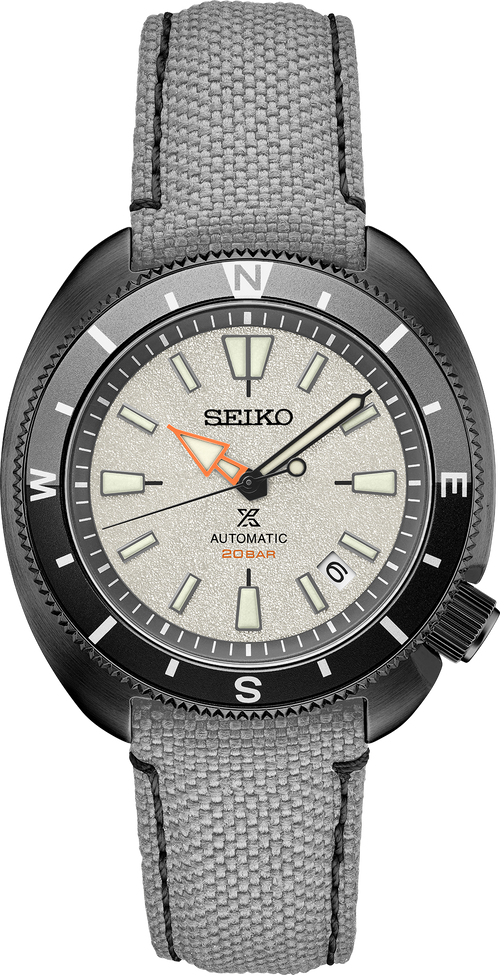 Prospex Land U.S. Special Edition. Designed for those who treat life as the ultimate adventure, Seiko Prospex keeps moving forward, meeting every challenge with technological excellence and winning design. Recalling the styles and earth-tone shades of the 1970s, as well as the colors of camping gear, this expanded collection is designed specifically for outdoor activities such as hiking, including a gray and black compass bezel and a listing of emergency codes on each screwdown caseback. Providing reliable timing for every adventure, the 23-jewel automatic movement beats at a frequency of 21,600 vibrations per hour, with a power reserve of approximately 41 hours, and offers manual winding capability. Based on an iconic Seiko design, with sleeker, more compact lines for everyday wear, this versatile watch features a textured gray dial with orange accents, date calendar, and LumiBrite hands and markers. In stainless steel with black hard coating, secure screwdown crown and scratch-resistant sapphire crystal, this exceptional timepiece includes a gray nylon/leather hybrid strap as well as an additional strap in black leather. 20 bar, 200M Water Resistant