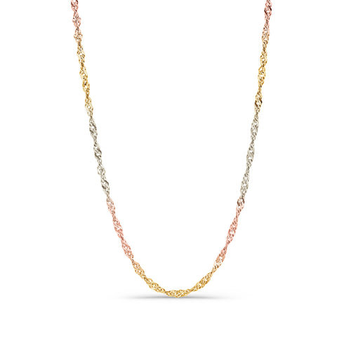 Vibrant and eye-catching, this 14k tri-color Singapore chain combines yellow, white, and rose gold for a radiant, dynamic finish. The twisted link design catches light beautifully, giving it depth and movement. Its smooth texture and sturdy build make it perfect for both daily wear and special occasions, adding a touch of color and sophistication to any style.