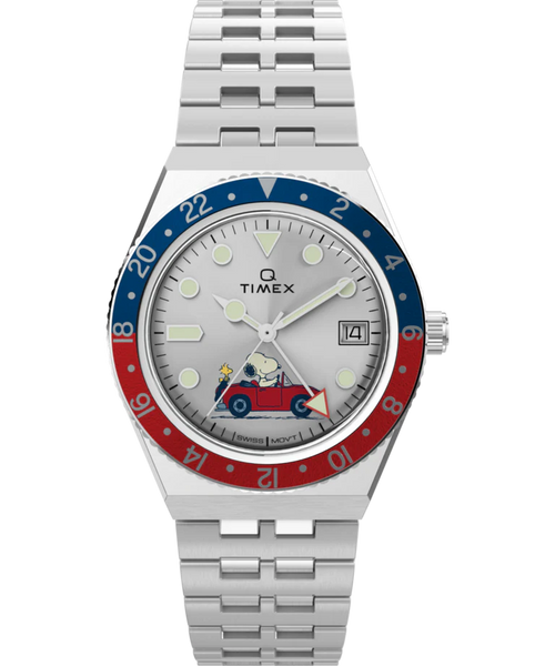 Follow Snoopy and Woodstock across the horizon with the Q Timex GMT, where a silver sunray dial brings your Peanuts world to life. A red and blue rotating bezel teams with a contrasting GMT hand to track a second time zone with ease. The luminescent hands and hour markers make reading time simple in every light, and the stainless steel case and bracelet give it lasting weight and shine. At 50 meter water resistance, it handles spills and rain with confidence.