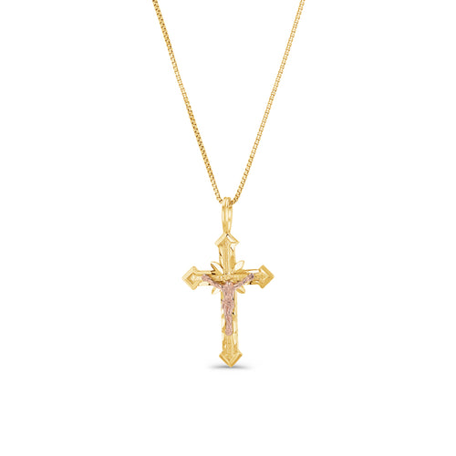 The Vintage Style Cross Crucifix Pendant in 14k gold carries timeless reverence with an artisan touch. Detailed edges and soft rose gold accents bring depth to the classic crucifix form, highlighting the craftsmanship in every contour. Its polished finish glows with warmth, creating a meaningful piece that blends faith and elegance with vintage character.