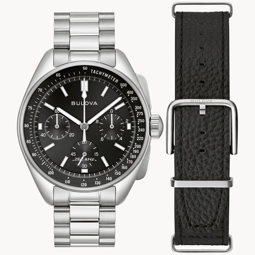 Inspired by Bulova’s original chronograph worn on the moon, this Lunar Pilot model pairs legacy design with modern accuracy. Its high-frequency stopwatch movement keeps time to within seconds a year, while the black dial with luminous markers and a tachymeter scale makes timing intuitive. A stainless steel bracelet and included NATO leather strap adjust easily for any setting. With scratch-resistant sapphire glass and water resistance to 50 meters, it handles everyday use confidently.