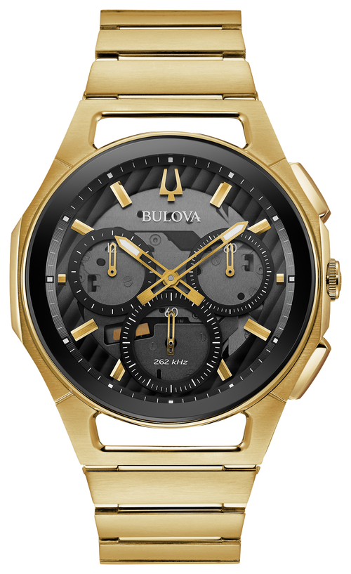 Experimente la fusión de innovación y elegancia con este reloj de la colección CURV de Bulova. Su diseño ergonómico, con el primer movimiento de cronógrafo curvo del mundo, se adapta cómodamente a su muñeca, brindándole estilo y comodidad. El movimiento de cuarzo de alto rendimiento, con una vibración de 262 kHz, garantiza una hora precisa, manteniéndole puntual en cualquier ocasión. La caja y el brazalete de acero inoxidable dorados irradian sofisticación, mientras que la esfera negra y gris ahumado transparente, adornada con agujas e índices dorados, ofrece un contraste impactante que facilita la lectura. Protegida por un cristal de zafiro curvo antirreflejos, la esfera se mantiene transparente y resistente a los arañazos. El fondo de caja, con una tapa transparente, permite admirar el intrincado movimiento, demostrando el compromiso de Bulova con la artesanía.