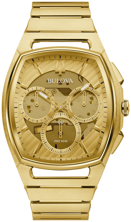 Realce su colección de relojes con un reloj que combina a la perfección innovación y elegancia. Este reloj de la colección CURV de Bulova incorpora el primer movimiento de cronógrafo curvo del mundo, que garantiza un ajuste cómodo que se adapta a su muñeca. El movimiento de cuarzo de alto rendimiento, con una frecuencia de vibración de 262 kHz, ofrece una precisión inigualable, manteniéndole puntual en cualquier ocasión. La caja y el brazalete de acero inoxidable dorados, con forma de tonel, irradian sofisticación, mientras que la esfera color champán con agujas e índices luminiscentes facilita la lectura. Protegida por un cristal de zafiro curvo con revestimiento antirreflectante, la esfera se mantiene impecable con el paso del tiempo. El fondo de caja, con una tapa transparente, permite admirar el intrincado movimiento, demostrando el compromiso de Bulova con la artesanía.