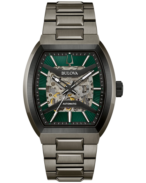 Power and precision come to life in the Bulova Maquina Automatic. A green patterned dial exposes the heartbeat of its mechanical movement, creating a display that’s as dynamic as it is refined. The gun metal stainless steel case and bracelet deliver a bold, industrial edge, while the curved sapphire crystal completes the look with modern polish. Designed to turn heads, it’s a statement piece built for those who move with confidence.
