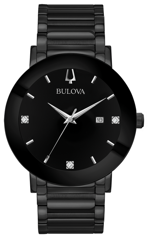 Esfera negra con tres marcadores de hora de diamantes engastados a mano.
