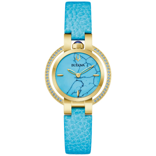 This shimmering Rubaiyat Summer brings a splash of elegance to your day. The reconstituted turquoise dial is unique on every wrist, and the blue topaz bezel provides a touch of refined sparkle. Lightweight at 30 mm and paired with a soft leather strap, it feels comfortable whether you're on the go or settling in for a meeting. Powered by precise quartz movement, it keeps you on time without fuss. The sapphire crystal and splash resistance ensure everyday durability, and the spinel-crowned crown adds a thoughtful, luxurious touch.