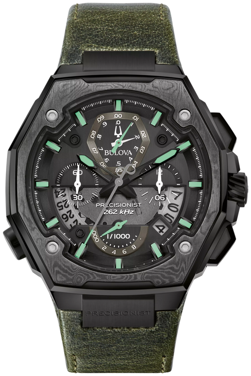 Celebrando una década de precisión inigualable, este reloj de edición especial encarna la innovación y un diseño audaz. La esfera negra, acentuada con marcadores y agujas luminiscentes verdes, ofrece una legibilidad excepcional, mientras que la función de cronógrafo de ocho agujas proporciona una precisión de hasta milésimas de segundo. La indicación de la fecha entre las 4 y las 5 en punto añade una funcionalidad práctica. Fabricado con una caja de acero inoxidable negro de 45 mm y un inserto de anillo superior de acero de Damasco gris, este reloj irradia robustez y sofisticación. El cristal de zafiro curvado con revestimiento antirreflectante garantiza durabilidad y claridad. La correa de piel verde con cierre desplegable ofrece un ajuste seguro y cómodo, ideal tanto para ocasiones formales como para el día a día.