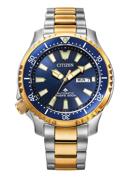 Audaz, funcional y diseñada para la aventura, la edición "Fugu" del Promaster Dive Automatic destaca por su vibrante esfera azul y su distintivo bisel dentado, inspirado en el pez globo. Las manecillas y marcadores luminosos garantizan visibilidad en condiciones de poca luz, mientras que la caja y el brazalete de acero inoxidable bitono ofrecen durabilidad y un aspecto clásico. Una corona atornillada a las 8 mejora la resistencia al agua, y el sólido fondo de caja luce un grabado de un fugu, uniendo los elementos temáticos del reloj. Impulsado por el movimiento automático Calibre 8204 de Citizen, ofrece una reserva de marcha de 42 horas y un rendimiento fiable para cualquier aficionado al buceo.