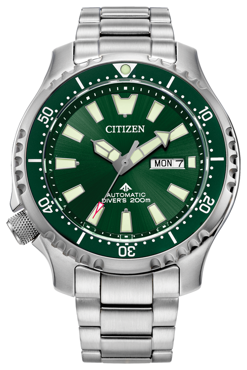 Resistente, fiable y listo para las profundidades, la edición Fugu del Promaster Dive Automatic destaca por su vibrante esfera verde y su distintivo bisel dentado, inspirado en el pez globo. Las manecillas y marcadores luminosos garantizan visibilidad en condiciones de poca luz, mientras que la caja y el brazalete de acero inoxidable ofrecen durabilidad y un aspecto clásico. Una corona atornillada a las 8 mejora la resistencia al agua, y el sólido fondo de caja luce un grabado de un fugu, que une los elementos temáticos del reloj. Impulsado por el movimiento automático Calibre 8204 de Citizen, ofrece una reserva de marcha de 42 horas y un rendimiento fiable para cualquier aficionado al buceo.