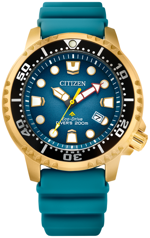 Sumérgete en la aventura con un reloj que combina un diseño audaz y un rendimiento fiable. Una caja de acero inoxidable dorado de 44 mm enmarca una vibrante esfera turquesa, con agujas e indicadores luminosos para una mejor visibilidad bajo el agua. El bisel giratorio unidireccional, con detalles en negro, permite un seguimiento preciso de los tiempos de inmersión. Una correa de poliuretano turquesa a juego garantiza comodidad y durabilidad durante las actividades acuáticas. Equipado con tecnología Eco-Drive, aprovecha la luz de cualquier fuente, eliminando la necesidad de cambiar la pila. Cumple con la normativa ISO y es sumergible hasta 200 metros, diseñado para soportar los rigores de la exploración submarina.