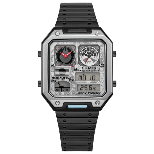This Star Wars Ana‑Digi watch brings galactic style and dual‑time precision to your day. The sleek silver-tone analog and digital dial combines subtle red highlights with LCD subdials inspired by the Millennium Falcon’s speed motifs. You can track local and second time zones, plus view temperature, calendar, and chime features at a glance. The compact bracelet fits securely and keeps the watch close to your wrist whether you’re working or traveling. Precise quartz accuracy and mineral crystal ensure dependable performance with minimal upkeep. Splash‑resistance adds resilience wherever life takes you.