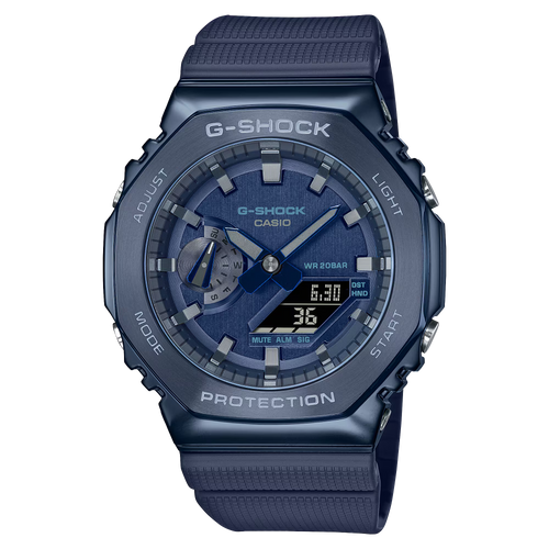 Luce un estilo elegante, definido y audaz con la nueva correa azul y bisel IP gris oscuro GM2100N-2A, una versión octogonal con revestimiento metálico del icónico diseño original. Forjado en acero inoxidable con un acabado redondeado y fino, el robusto bisel derrocha estilo. La esfera está tratada con deposición de vapor para lograr un aspecto metálico meticulosamente detallado, ideal para un reloj G-SHOCK clásico de metal. Las variaciones graduales en la detallada textura de puntos cuadrados de la correa elevan el estilo informal de los materiales de uretano a un nivel superior.