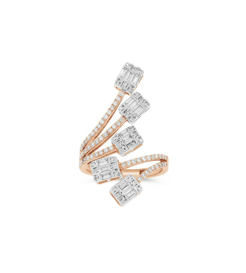 El anillo de cóctel de diamantes en oro rosa está diseñado para quienes cuidan su estilo y aprecian las líneas audaces y los detalles lujosos. Ya sea como pieza central individual o combinado con un conjunto de anillos, esta pieza aporta una geometría impactante y el brillo del oro rosa a tu look diario o de noche.