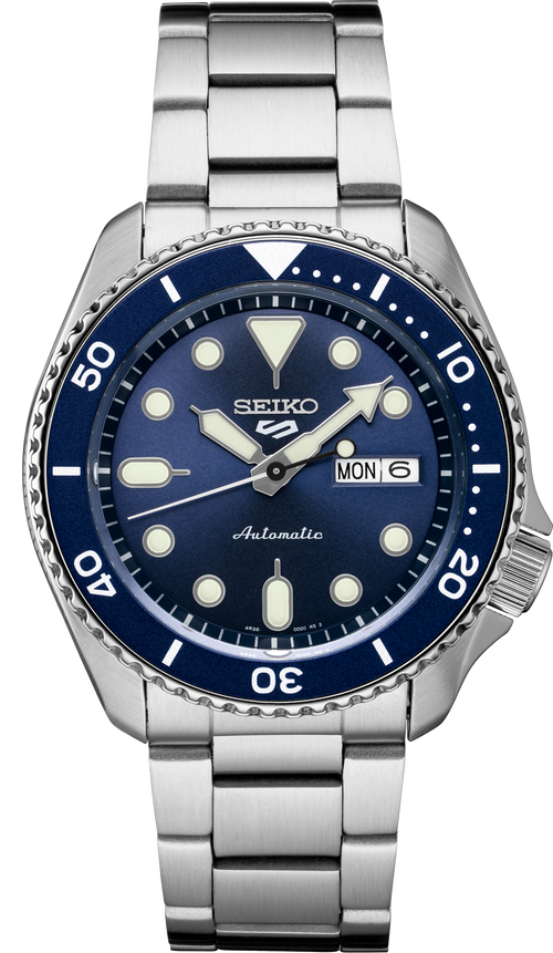 Muestra tu estilo. Atrévete. Durante más de 50 años, Seiko 5 Sports ha ofrecido altos niveles de fiabilidad, durabilidad y rendimiento. Para una medición del tiempo fiable en tu día a día, este excepcional reloj está impulsado por un movimiento automático con una reserva de marcha de aproximadamente 41 horas e incluye calendario día/fecha, manecillas y marcadores LumiBrite, y fondo de caja transparente. Con una resistente caja y brazalete de acero inoxidable y una esfera azul con efecto rayos de sol enmarcada por un bisel giratorio azul, este versátil reloj es resistente al agua hasta 100 metros, perfecto para tu estilo, sea cual sea el día.