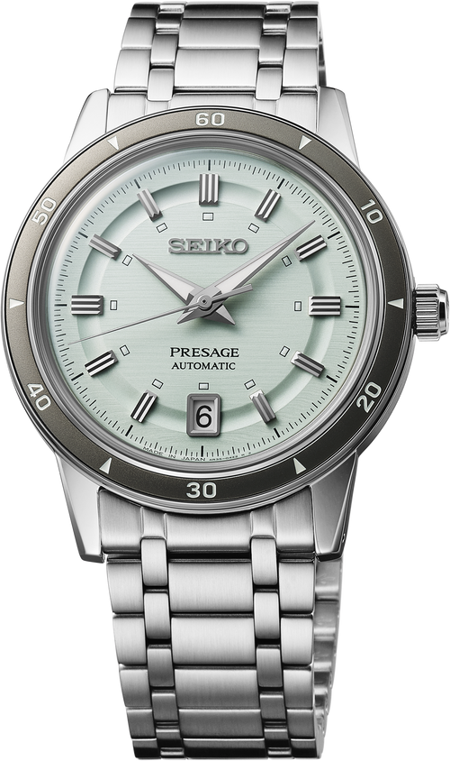 Fresh, retro, and full of flair, this Seiko brings a touch of mid century character with its mint green multi layer dial and curved aluminum bezel. The polished case and bracelet give it refined presence on the wrist, while the box shaped Hardlex crystal and faceted indices catch the light beautifully. Powered by an automatic movement, it offers dependable performance and timeless appeal for everyday wear.