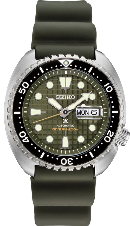 Prospex Automático de Buceo. Diseñada para quienes viven la vida como una aventura, la línea Seiko Prospex supera cualquier desafío con excelencia tecnológica y un diseño ganador. Actualizando un estilo icónico con un bisel de cerámica y un cristal de zafiro con revestimiento antirreflectante en la superficie interior, este reloj robusto y a la vez distintivo ofrece un patrón prensado tridimensional en la esfera verde caqui, que imita la forma del borde del bisel. Las manecillas y marcadores LumiBrite, y una ventana de día/fecha con aumento, garantizan una legibilidad óptima en condiciones adversas. El movimiento automático de 24 rubíes late a una frecuencia de 21.600 alternancias por hora, con una reserva de marcha de aproximadamente 41 horas, y se puede dar cuerda de forma manual o automática. En acero inoxidable, con bisel giratorio unidireccional de cerámica negra con temporizador transcurrido, corona y fondo de caja atornillados de seguridad, y una resistente correa de silicona verde caqui, este reloj de alta intensidad cumple con las normas ISO para buceo. Resistente al agua hasta 200 m.