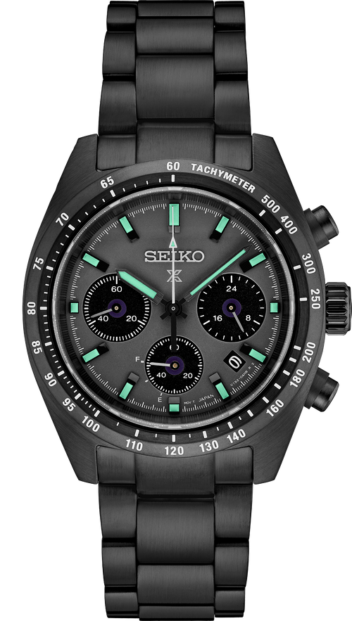 Cronógrafo solar Speedtimer Prospex Black Series. Diseñado para quienes viven la aventura, Seiko Prospex sigue avanzando, superando cada reto con excelencia tecnológica y un diseño ganador. Este espectacular reloj forma parte de una colección de alta intensidad inspirada en el "Speedtimer" de 1969, el primer cronógrafo automático del mundo, que se extiende a la Black Series. Con el nuevo "Green LumiBrite Pro", desarrollado para buceadores combinando el color más reconocible en la oscuridad con un mayor brillo y una persistencia luminosa más prolongada, este extraordinario reloj proporciona una "visión nocturna" para una visibilidad en la oscuridad similar a la vista que se obtiene a través de un telescopio nocturno. La función de cronógrafo mide hasta 60 minutos de tiempo transcurrido en incrementos de 1/5 de segundo e incluye una función de tiempo fraccionado, mientras que la celda solar, alimentada por cualquier fuente de luz, sin necesidad de cambiar la batería, proporciona una reserva de energía de 6 meses con la carga completa. La esfera gris oscuro incluye tres subesferas negras, con indicador de 24 horas e indicador de reserva de marcha, además de calendario y LumiBrite verde en las manecillas, marcadores y la punta de la aguja del cronógrafo. Fabricada en acero inoxidable con revestimiento endurecido negro, cristal de zafiro curvo antirreflejos, bisel taquimétrico negro, fondo de caja atornillado y brazalete cónico de tres eslabones con cierre de botón pulsador triple. Resistente al agua hasta 100 m y 10 bares.