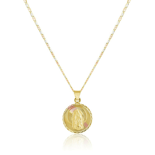 Celebre la fe y la tradición con este pequeño medallón tricolor de Nuestra Señora de Guadalupe. Elaborado con maestría en tonos oro amarillo, blanco y rosa, este colgante redondo presenta una representación detallada de la venerada Virgen de Guadalupe. Su tamaño compacto y su diseño intrincado lo convierten en un preciado recuerdo, perfecto para el día a día o para ocasiones especiales.