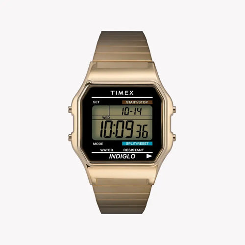 This Timex Classic Digital Watch combines vintage retro style with everyday practicality. The gold tone square case gives it a timeless look, while the green digital display shows time, day, month, and date clearly. The INDIGLO backlight provides easy visibility in low light, and quartz accuracy keeps you on schedule without hassle. With stopwatch and alarm functions, this chronograph digital watch is ideal for timing daily tasks. The expansion bracelet ensures a comfortable fit throughout the day, and with 30 meter water resistance plus a durable mineral crystal, it is designed for reliable everyday wear.