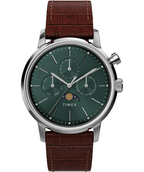 This is the kind of watch that does more than tell time. It adds character to your every move. From early meetings to late dinners its deep green dial draws compliments while the moon phase display brings a poetic touch that sets it apart. It pairs just as effortlessly with a sharp blazer as it does with rolled sleeves and coffee in hand. Comfortable to wear and always accurate this timepiece becomes part of your rhythm quietly reliable subtly expressive and always ready for whatever your day holds.