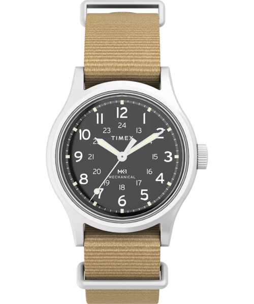This brushed stainless steel MK1 Hand‑Wound watch offers classic military styling with effortless daily function. A clean black dial with bold Arabic numerals and a dual 12/24 hour scale makes reading time fast and clear. Manual-wind movement puts you in control of power, requiring no battery for reliable timing. A lightweight beige fabric strap ensures comfort through movement and travel. With a domed acrylic crystal and 50 meter water resistance, it handles daily wear without fuss.
