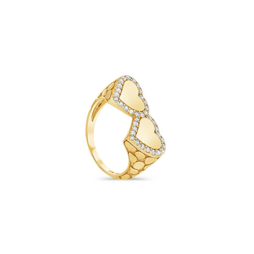A playful pulse of light defines this Twin Heart Nugget Ring, where two polished hearts sit side by side in a bold nod to retro glamour. Each heart is framed with bright cubic zirconia, creating a soft halo that sparkles with every gesture. The nugget textured shoulders add sculptural depth, giving the ring a richer presence and an unmistakably vintage inspired allure. It is a statement piece that feels personal and expressive, offering a romantic accent that stands out effortlessly in any jewelry collection.