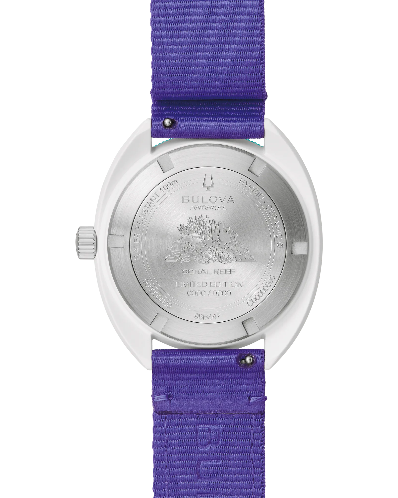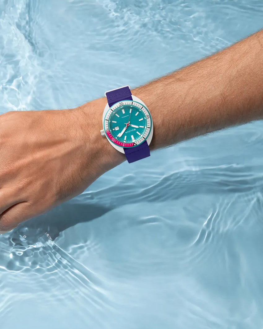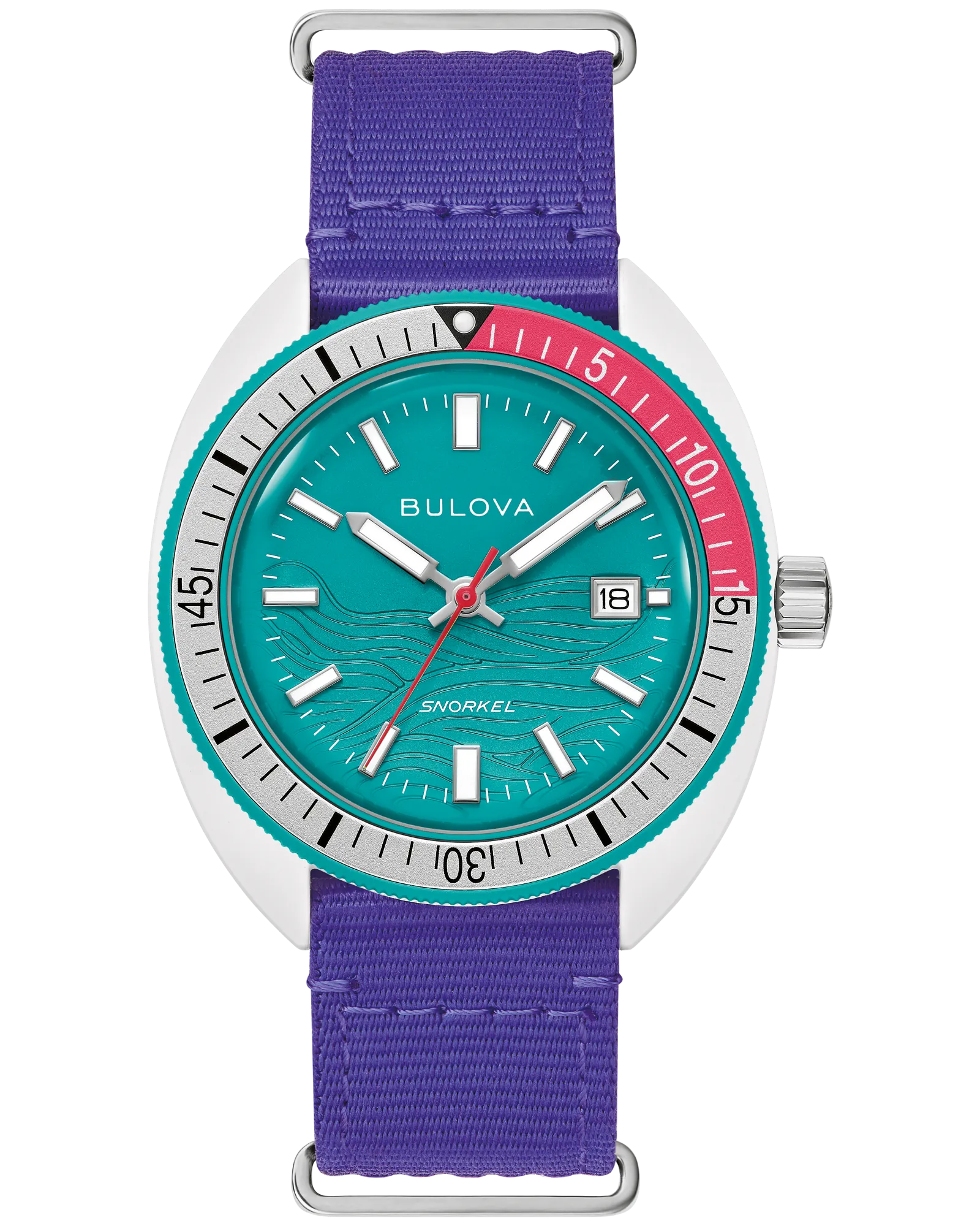 Inspired by the vibrant colors of coral reefs, this Bulova Snorkel Limited Edition stands out with a teal wave-pattern dial and a white hybrid ceramic case that feels both light and luxuriously smooth. The striking violet #TIDE Ocean Material® NATO strap is crafted from recycled ocean-bound plastic to support sustainability while maintaining bold style. With 100 meter water resistance, luminous markers and hands, and a rotating bezel, the watch is as ready for daily wear as it is for poolside or surfside moments.