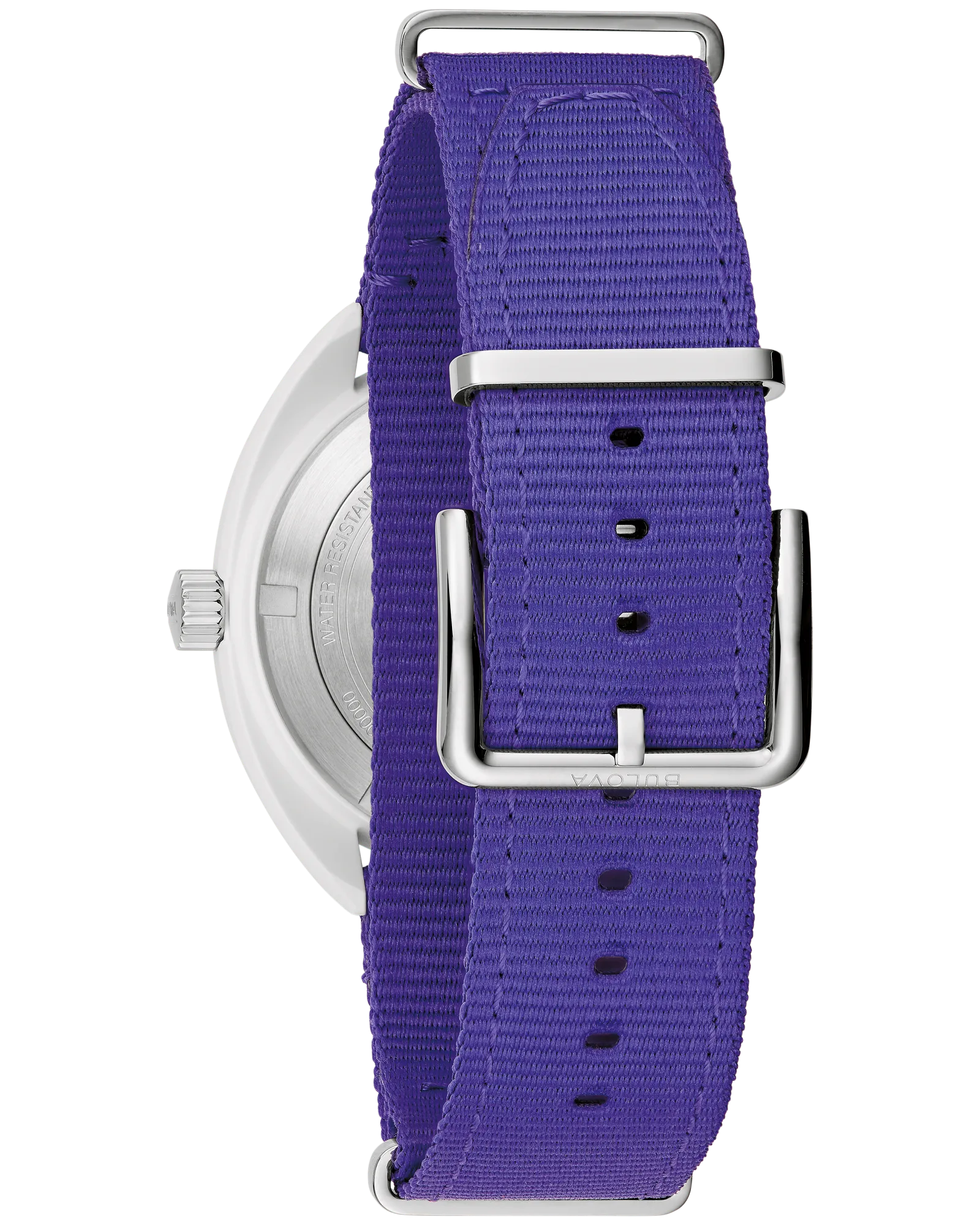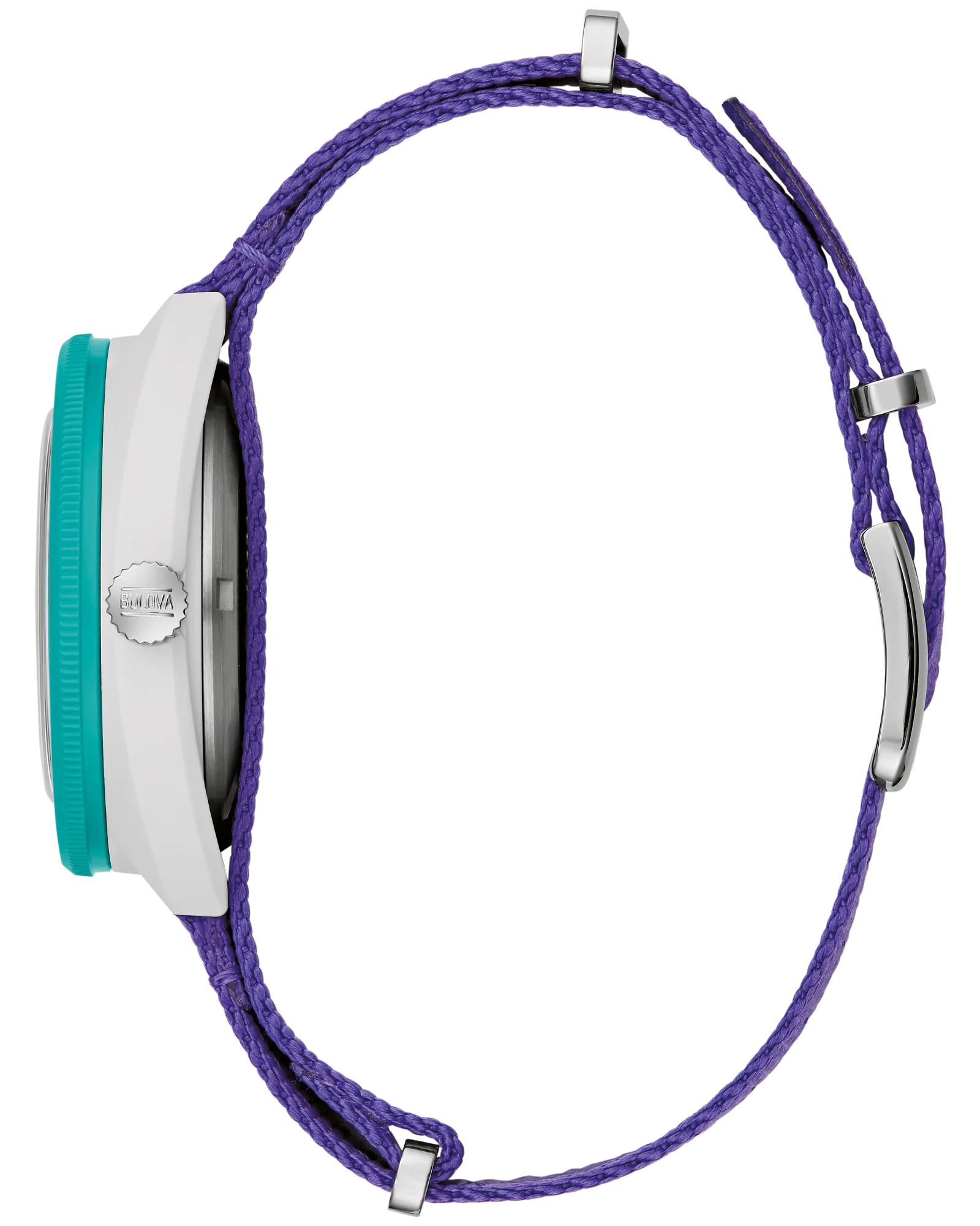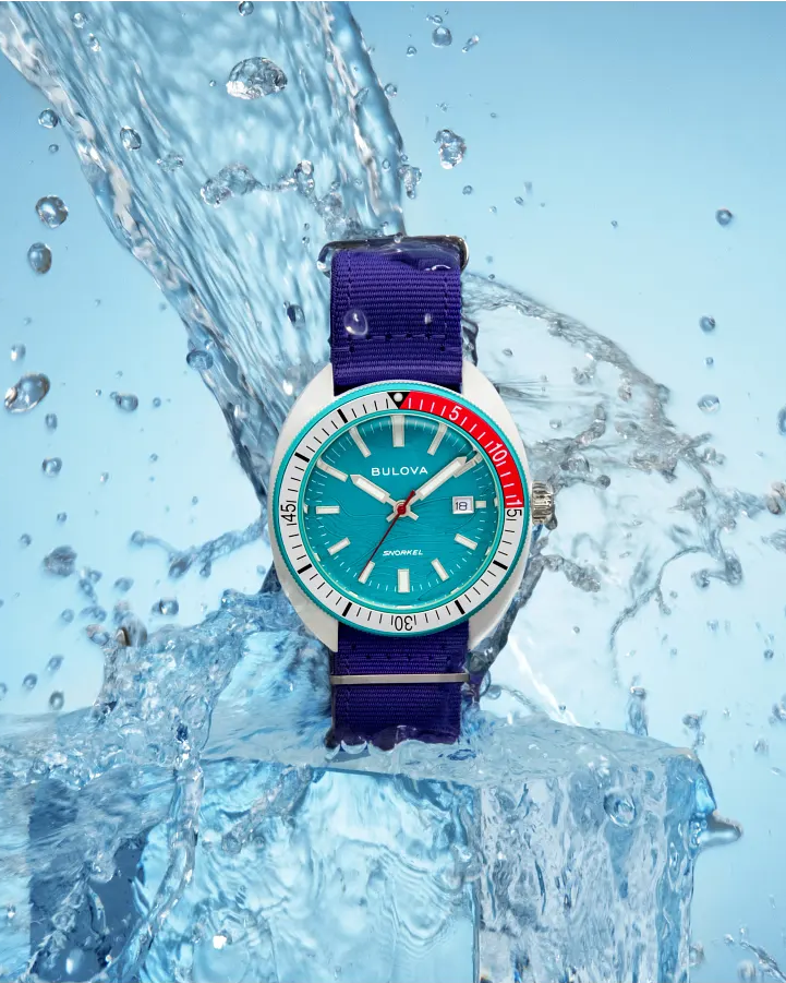 Inspired by the vibrant colors of coral reefs, this Bulova Snorkel Limited Edition stands out with a teal wave-pattern dial and a white hybrid ceramic case that feels both light and luxuriously smooth. The striking violet #TIDE Ocean Material® NATO strap is crafted from recycled ocean-bound plastic to support sustainability while maintaining bold style. With 100 meter water resistance, luminous markers and hands, and a rotating bezel, the watch is as ready for daily wear as it is for poolside or surfside moments.