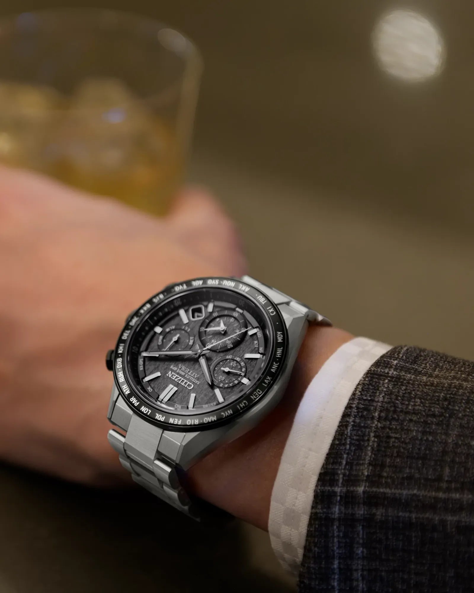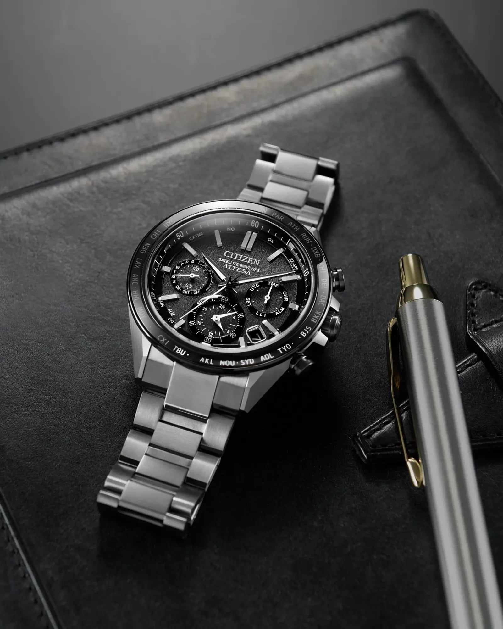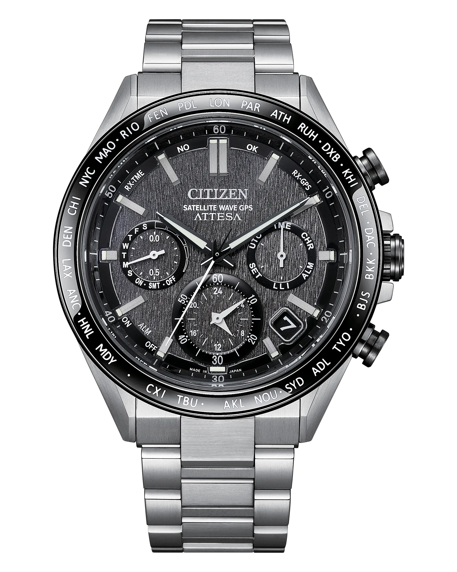 Powerful design and advanced technology drive the new luxury Attesa. Since its 1987 launch, Attesa has incorporated titanium-processing know-how and features innovative, world-first technologies that will continue to shape the future. A 44.6mm Super Titanium™ case and bracelet solidify the lightweight, durable construction of the timepiece, while a silver-tone and gray DLC alongside a duo of chronograph pushers and crown guards provide a dynamic and sporty touch. A world time bezel frames the textured gray dial and its three registers, with applied silver-tone accents and a date window between 4 and 5 o’clock adding dimensionality alongside utility.