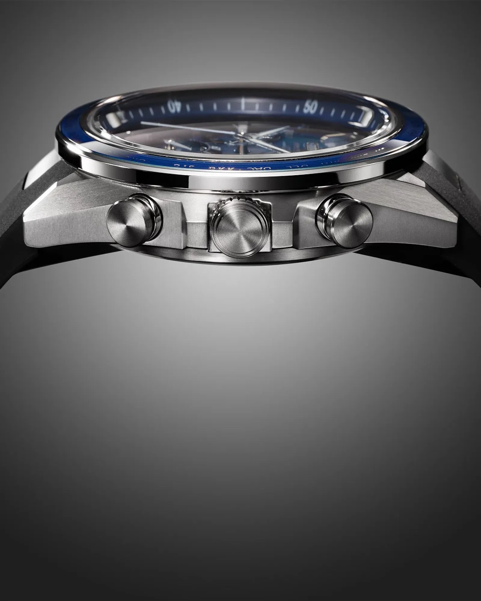 A 44.5mm Super Titanium™ case solidify the lightweight, durable construction of the timepiece, with the silver-tone case and a blue bezel insert. A duo of modern chronograph pushers and robust crown guards add a dynamic, sporty touch. A world time bezel frames the textured blue dial and its three registers, with applied silver-tone accents and a date window between 4 and 5 o’clock adding dimensionality alongside utility.