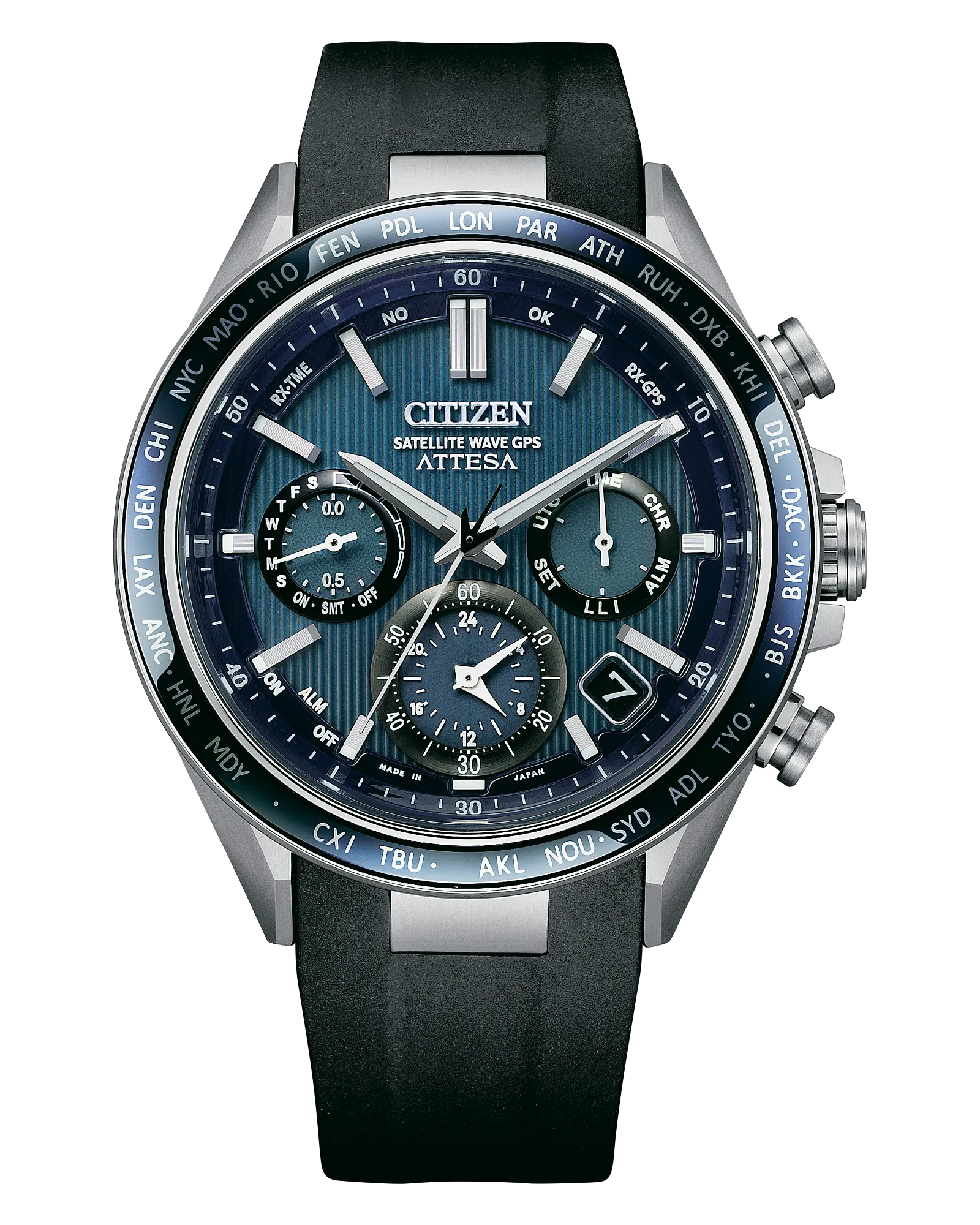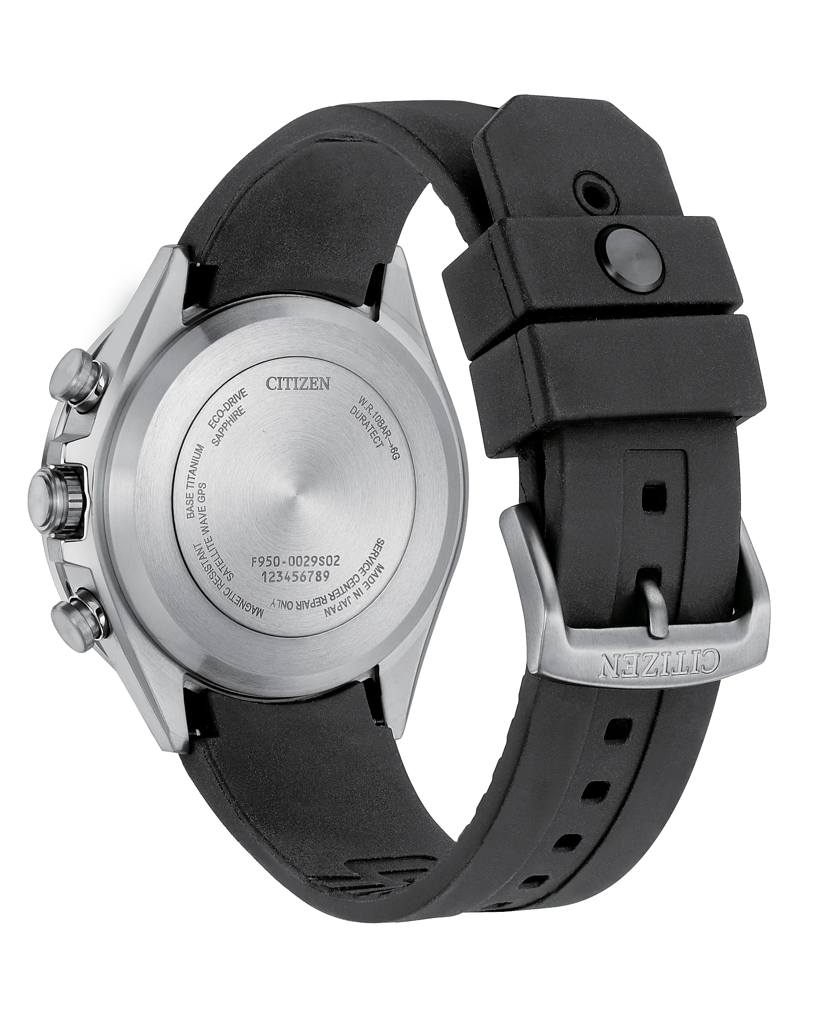 This model features the most advanced movement for Eco-Drive Satellite Wave GPS watches and delivers the world’s fastest time-only signal reception in as little as 3 seconds. Additional features include world time in 27 cities (40 time zones), a 1/20-second chronograph that measures up to 24 hours, dual time zones, alarm, day-date display, UTC (Universal Coordinated Time) display, perpetual calendar, daylight saving time indicator, as well as power reserve and light level indicators. Powered by Citizen’s proprietary Eco-Drive technology that's sustainably powered by light – any light – and never needs a battery. Water resistant to 100 meters. Caliber F950.