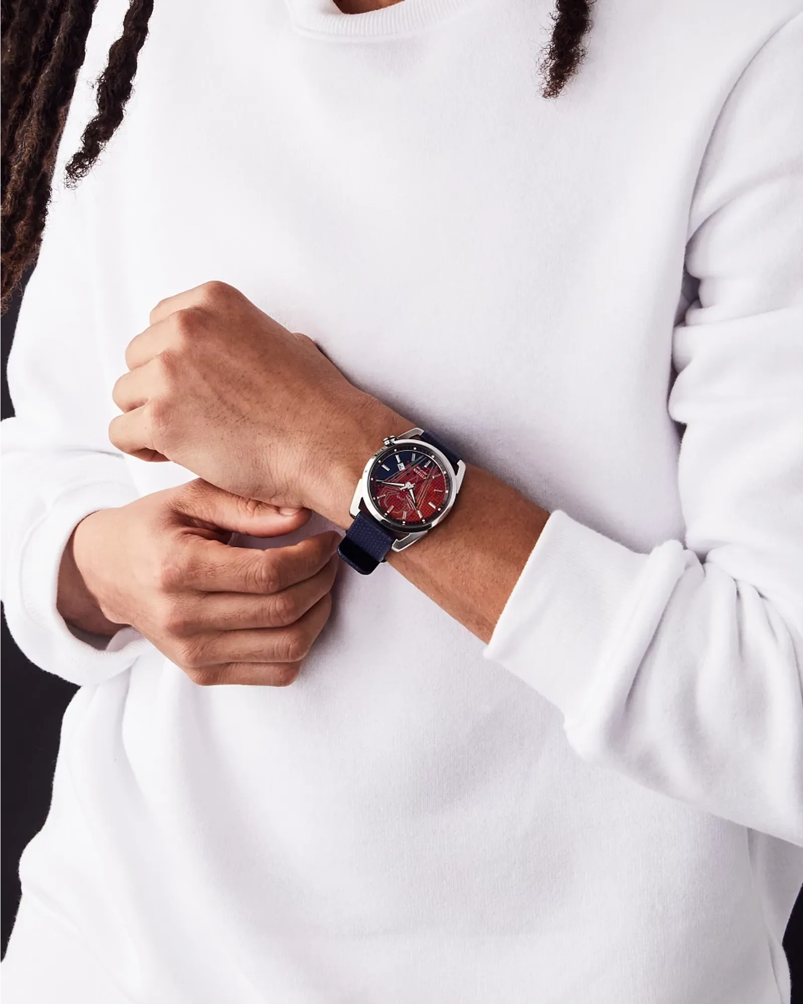 Multi color dial featuring raised Spider Man spider motif and grid pattern