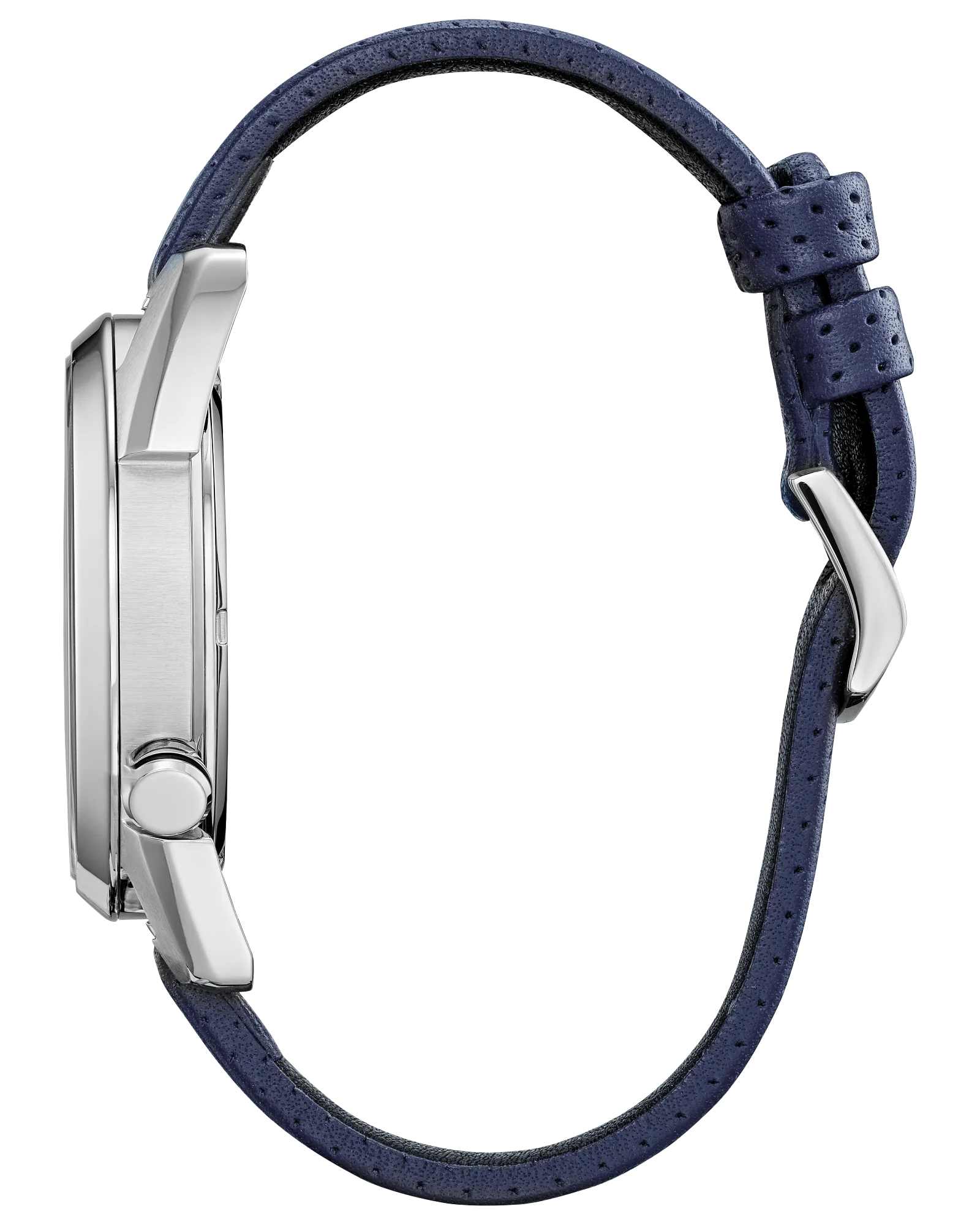 Stainless steel case paired with a blue perforated leather strap