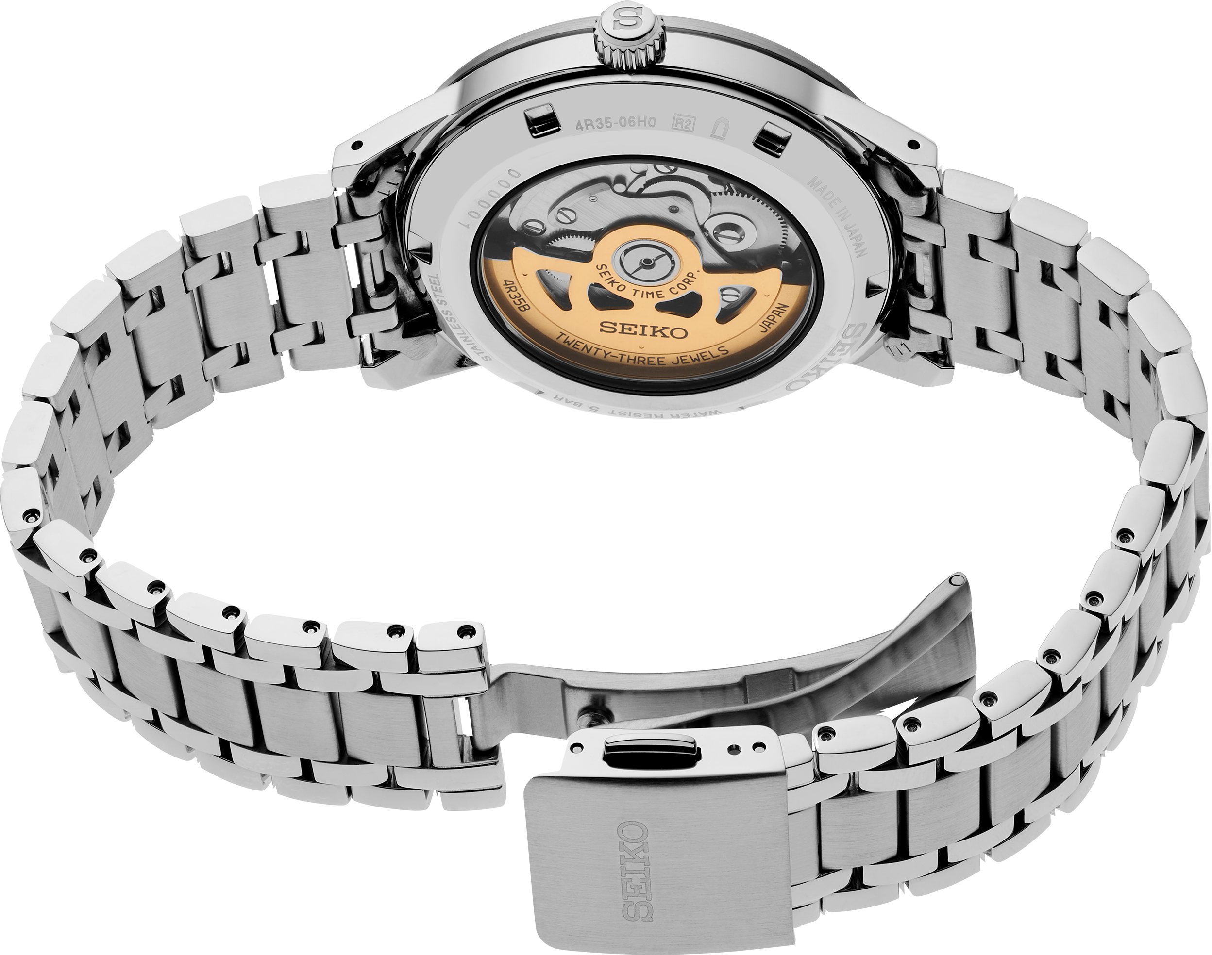 Expect vintage flair with modern polish in the Seiko Presage Style60’s version with a silvery violet multi-layer dial framed by a subtle grey bezel. The polished case and expressive dial textures command attention, while the steel bracelet gives it everyday strength. With an automatic movement and a see-through caseback, it brings mechanical beauty to your wrist in a sleek 39.5 mm silhouette.